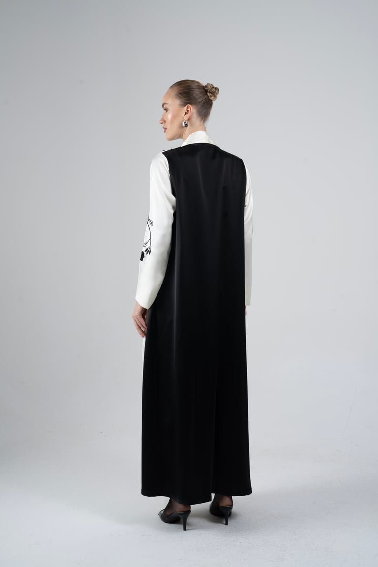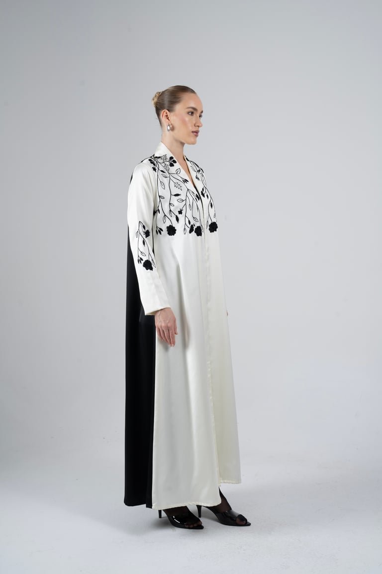 Embrace sophisticated contrast with the Elegance Noir Abaya, a stunning fusion of traditional grace and modern artistry. This exquisite piece is crafted from a luxurious, flowing off-white Silk fabric. The contemporary embroidery and color palette make it perfect for special occasions, evening wear, or upscale gatherings.