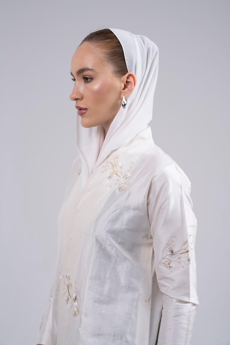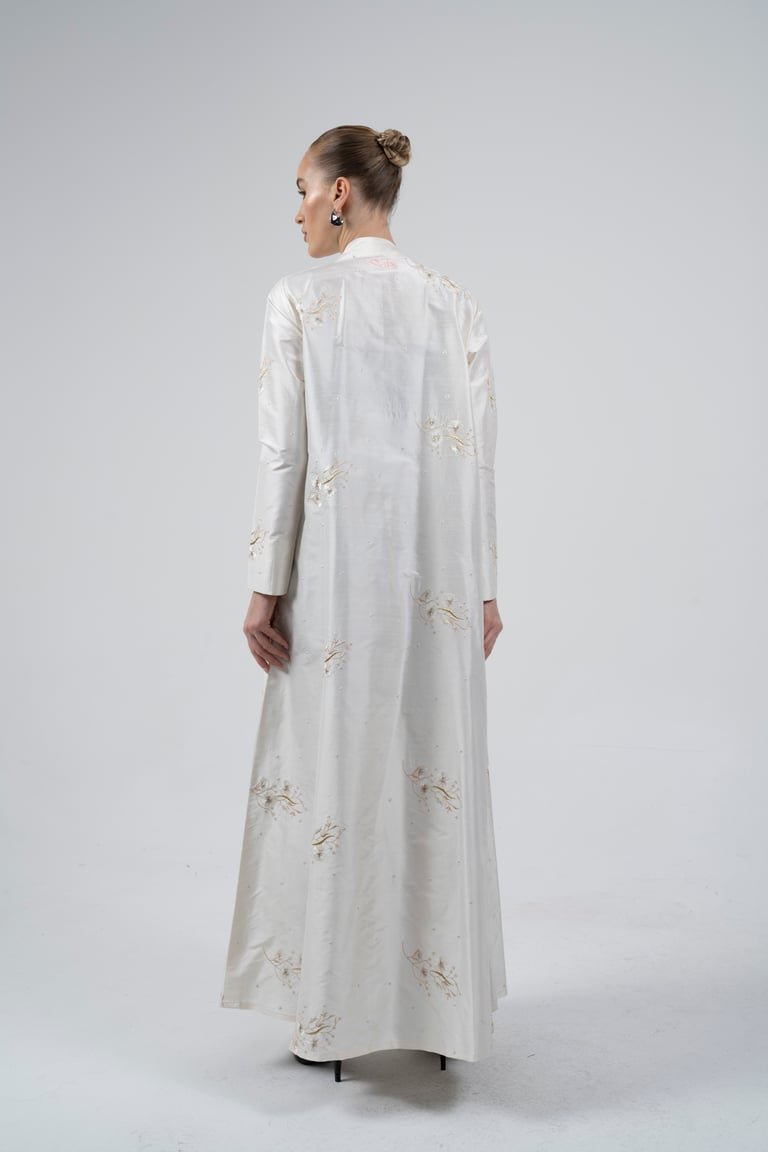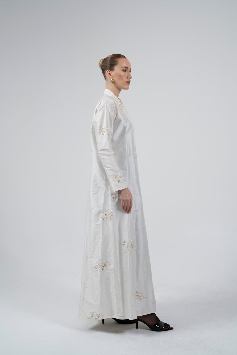 Experience radiant simplicity and understated luxury with the “Gilded Whisper” Abaya. Crafted from a pristine, natural fabric, this piece shines with soft texture and delicate, scattered embroidery. Perfect for a special occasion, an elegant brunch, or as a sophisticated garment for wedding-related events, offering classic modesty, luxurious texture, and soft shimmer.