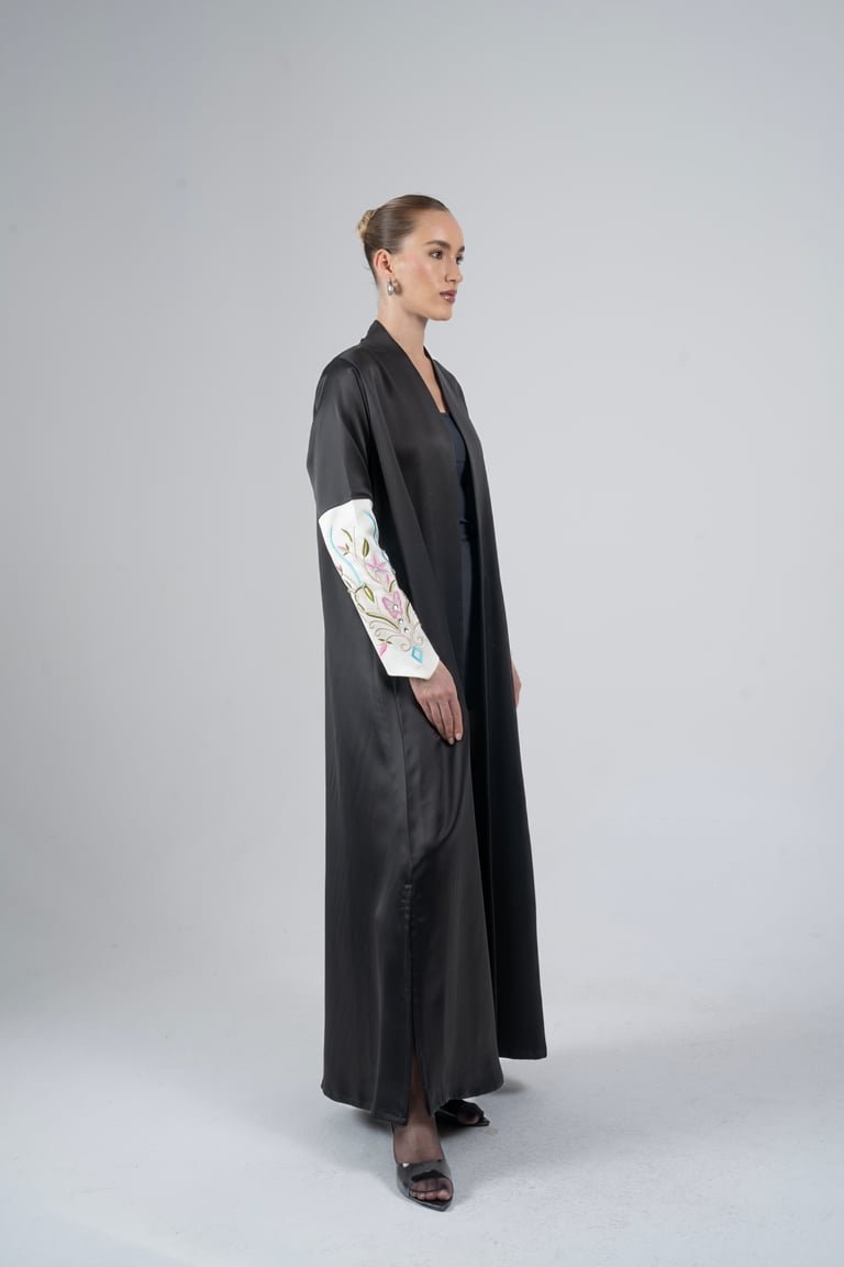 - Luxurious Dark Base: The main body of the abaya is crafted from a sumptuous, flowing dark fabric, a premium satin. This provides an effortlessly elegant drape and a slimming silhouette.